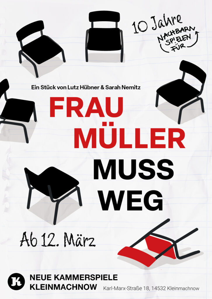 Zum zehnjährigen Jubiläum von NACHBARN SPIELEN FÜR NACHBARN zeigen wir das Stück, mit dem wir mal angefangen haben: FRAU MÜLLER MUSS WEG von Lutz Hübner und Sarah Nemitz.